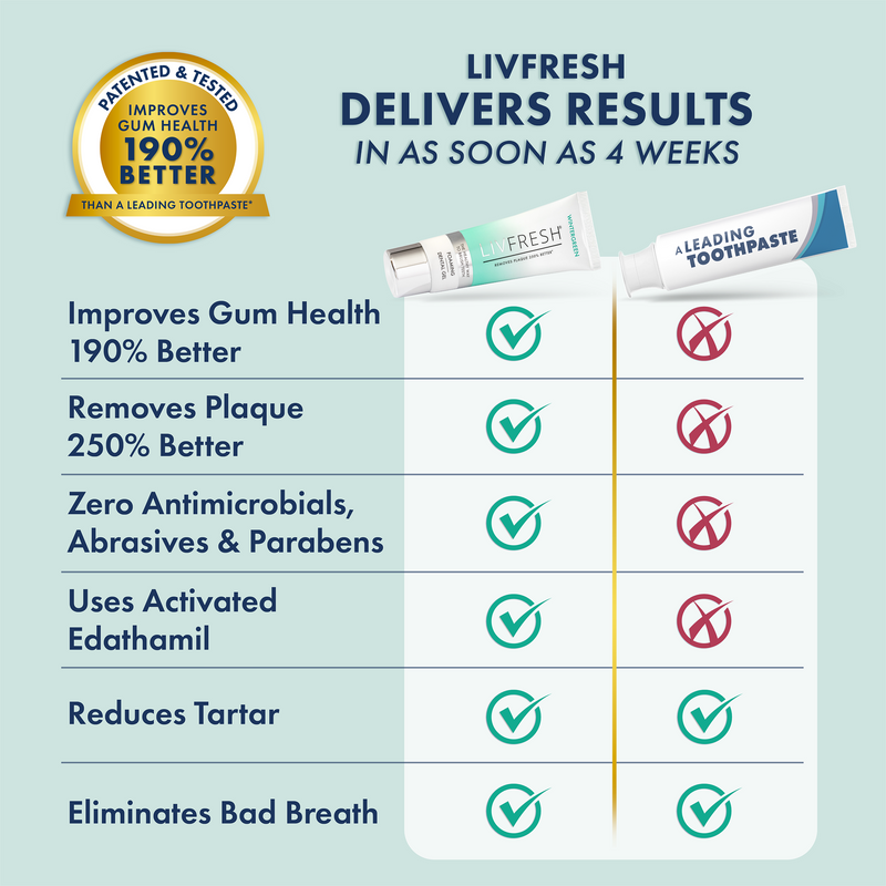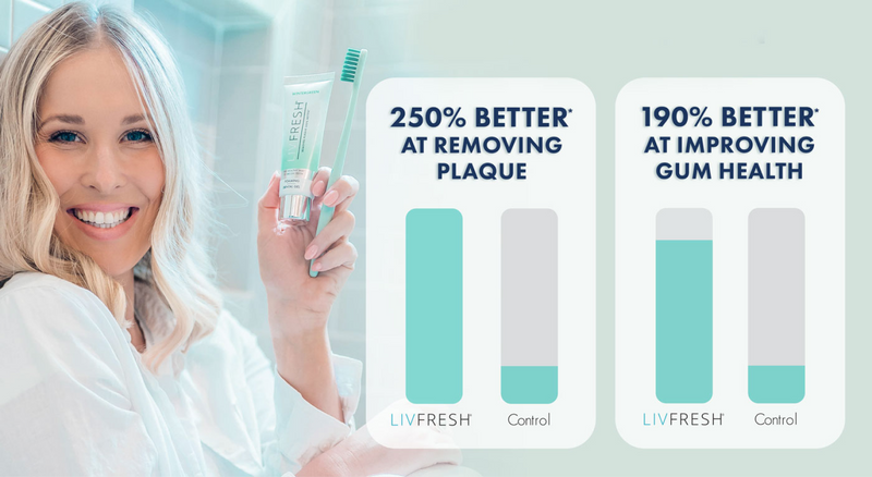 LivFresh is clinically proven to remove plaque 250% better, reduce tartar, eliminate morning breath, and reduce gum bleeding 190% more than leading brands. Our science is verified by 26 research studies at top US universities, 40 patents, & the United States Department of Defense.
